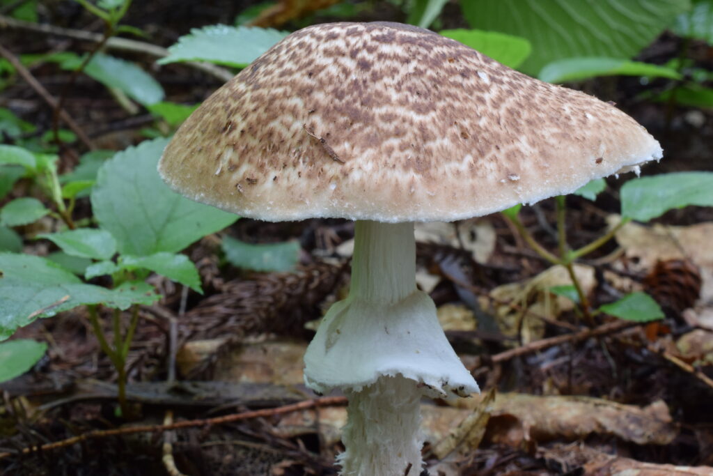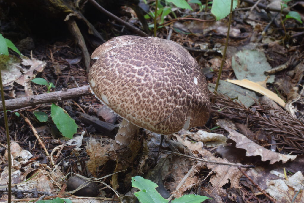 後日不明種の同定を図鑑を見ながらしていると、8月31日に見たキノコの幼菌と2週間後に同じ場所で見たキノコの成菌が同じ種ではないかと思い至りました。そしてそれはザラエノハラタケのようです。確信はありませんが、幼菌時のかさ一面のこげ茶が成菌になりその表面積を増やし、下地の白い部分が見えてきたのでは?と想像しました。この同定が正解かどうかわかりませんが、キノコの観察にはその対象物が、成菌の状態であればほとんどの図鑑に載っているのでわかりやすいですが、幼菌、老菌の状態ではそれらの成菌を想像するのが難しい種もあるようです。