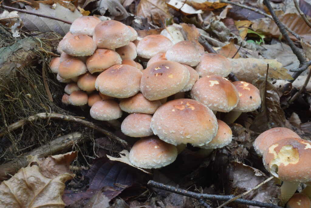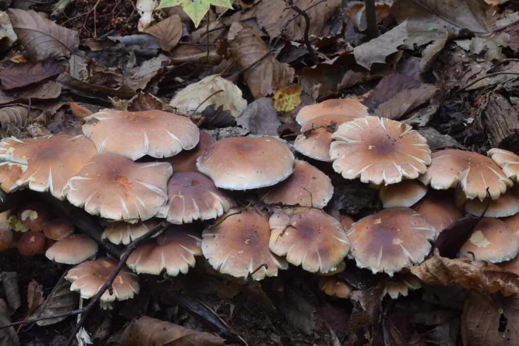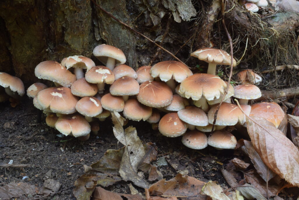 クリタケが出てきました。クリタケは毎年たくさん発生するので食用としていただきます。時期は10月上旬から11月上旬くらいでしょうか、初雪の頃まで発生します。大概の図鑑にはカンバ類やミズナラの切り株、あるいは広葉樹の切り株に発生とありますが、私が毎年確認するクリタケはクリの木の立ち枯れ木の根際に束生します。それ以外の樹種で発生しているのを見たことがありません。それと以前にも書きましたが、ほかの場所ではクリの立ち枯れ木の根際からナラタケが大量発生します。今回はあまり出てはいませんでしたが、2食分のかけうどんの具としていただきました。