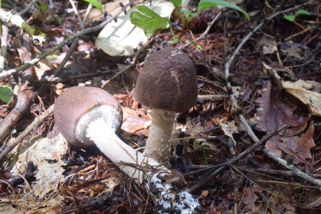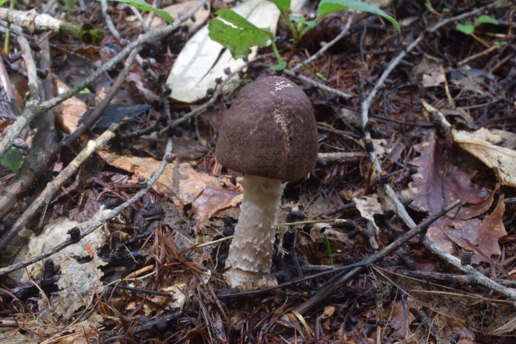 今年の8月31日小樽なえぼ公園の針葉樹林内を散策して今まで見たことのないキノコを見つけたのですが、同定できませんでした。まだ幼菌でかさが開いていない状態でした。かさはこげ茶色、柄には綿毛状の鱗片があります。かさ裏には内皮膜があり、ひだの様子がまだわかりません。成菌になったら同定できそうですが、とりあえず不明種リストに入れました。